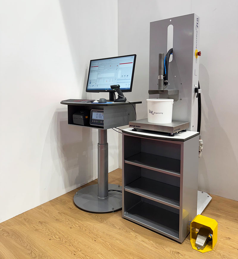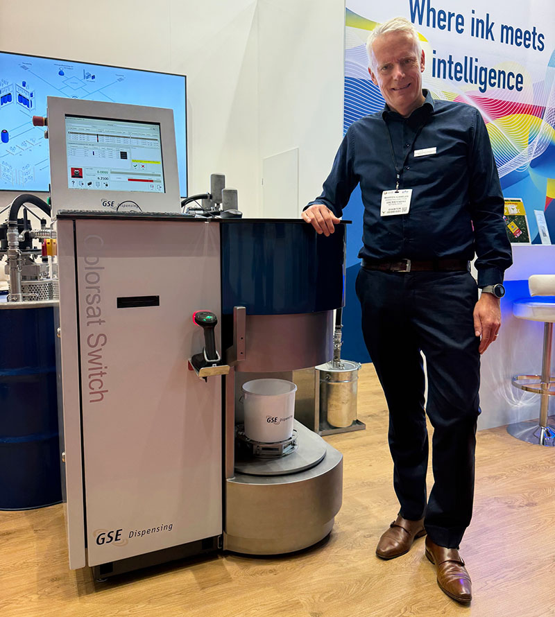 Também foram apresentados os dispensadores Colorsat Switch para impressão de etiquetas e – integrado ao FCS – o Colorsat Solo, para dosagem limpa de tintas monoingredientes como cores de processo, vernizes ou brancos diretamente de tambores ou IBCs. Todos os dispensadores GSE possuem peças modulares e intercambiáveis, garantindo flexibilidade e adaptação a novas configurações de tinta, volumes ou layouts de produção.