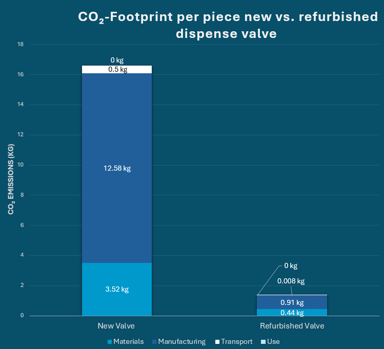 Het produceren van een nieuw ventiel veroorzaakt het grootste deel van de impact in materiaal en manufacturing, terwijl refurbishment van een bestaand ventiel slechts een minimale extra footprint toevoegt.